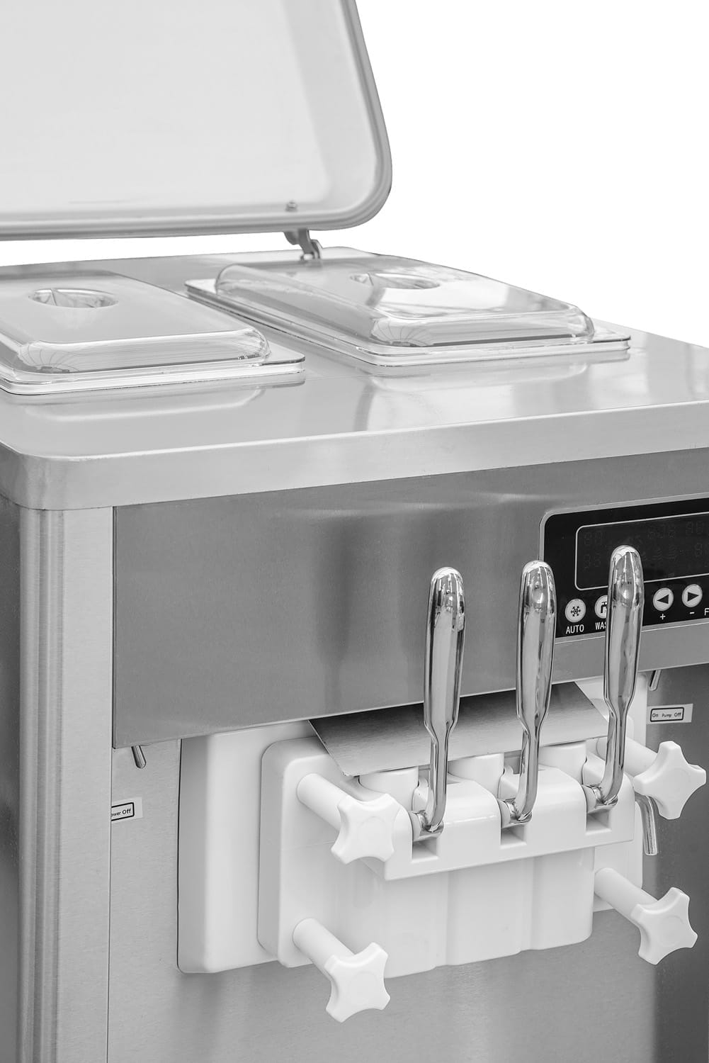 - Obudowa, uchwyty dozujące oraz zbiorniki na mieszankę lodową wykonane są ze stali nierdzewnej
