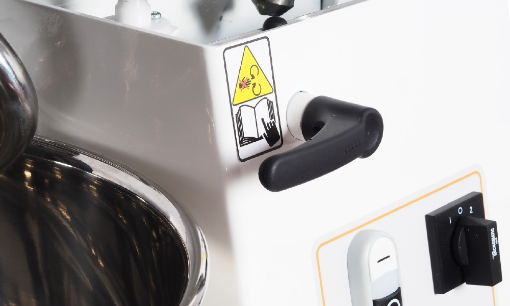 - Podniesienie osłony ochronnej dzieży powoduje natychmiastowe zatrzymanie pracy miksera, co zapewnia wysoki poziom bezpieczeństwa personelu