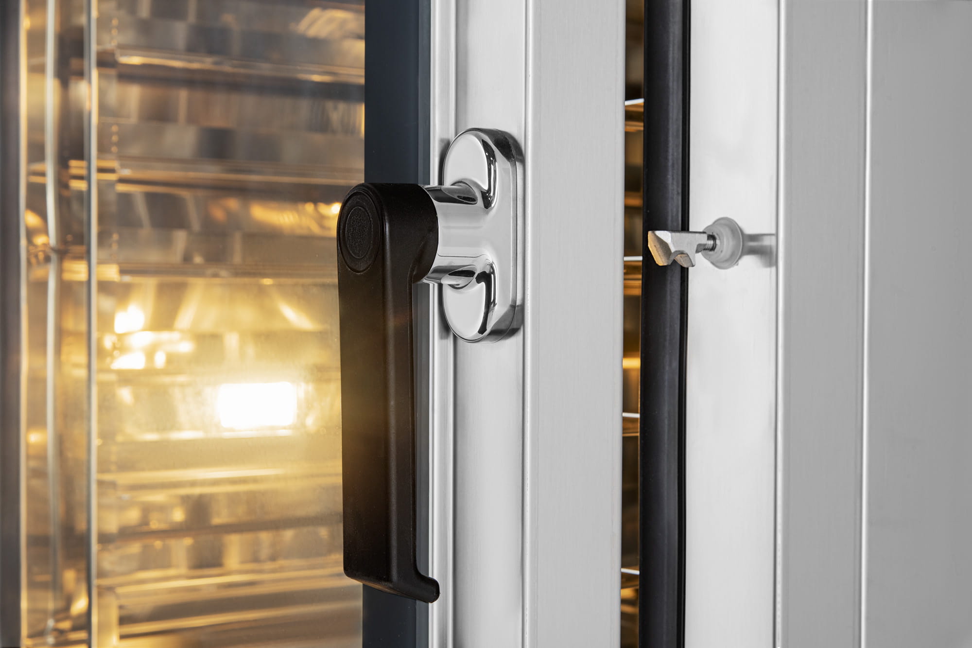 - Specjalna klamka oraz drzwi pieca wykonane z podwójnej szyby atermicznej zapobiegają oparzeniu i umożliwiają utrzymanie komory w czystości.