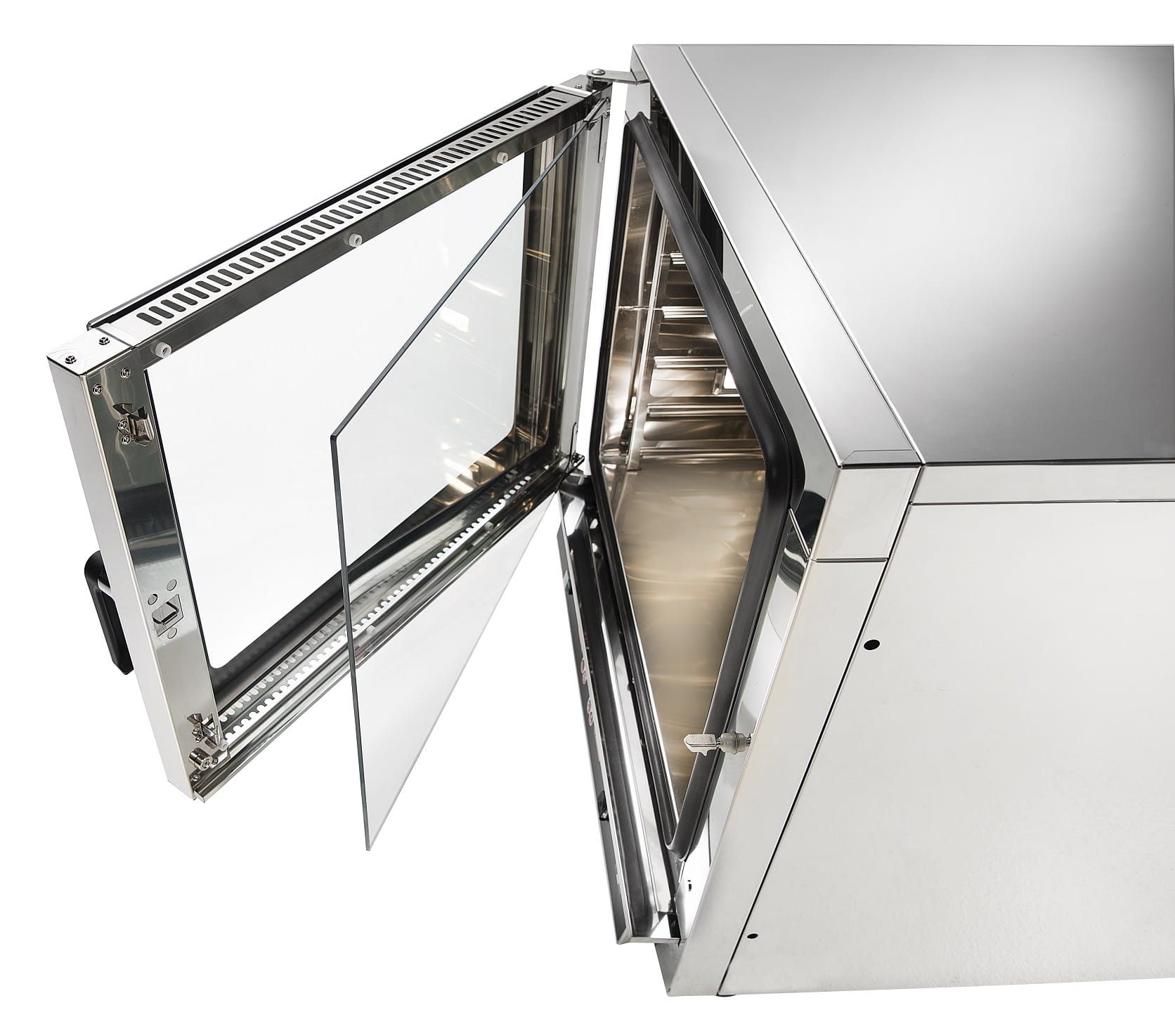 - Prowadnice wykonane z wytrzymałych profili ze stali nierdzewnej umożliwiają korzystanie z blach GN 1/1 oraz blach cukierniczo-piekarniczych 600x400mm.