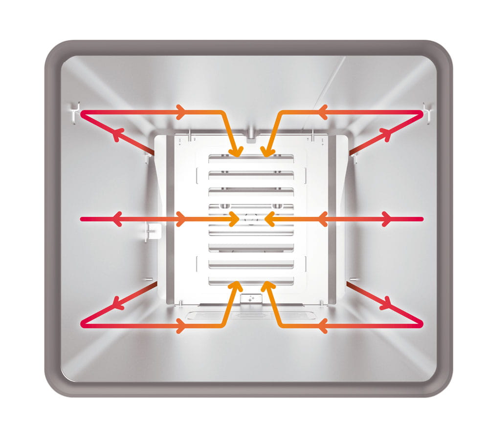 Szybsze i bardziej równomierne gotowanie dzięki termodynamicznej konstrukcji wentylatora w połączeniu z z inteligentnym zarządzaniem prędkością i kierunkiem obrotów
