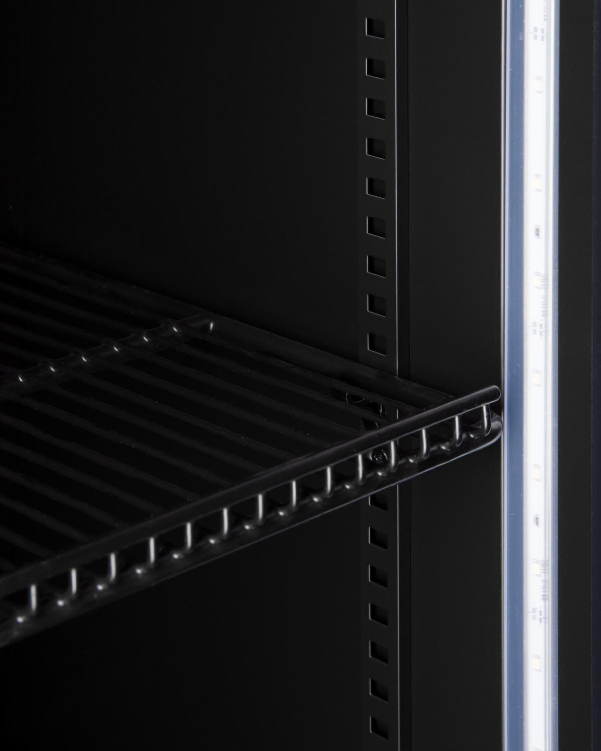- Wnętrze szafy chłodniczej jest doświetlone oświetleniem LED, podkreślającym ekspozycję produktów.